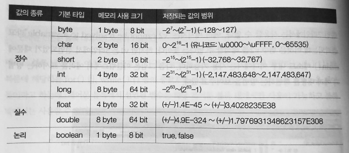 float과 double의 메모리 사용 크기는 각각 int와 long의 크기와 같지만, 정수 타입과는다른 저장 방식 때문에 훨씬 더 큰 범위의 값을 저장할 수 있음.
