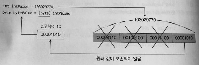 자동 타입 변환 (promotion) : 큰 크기 타입 <- 작은 크기 타입 (메모리 크기) - byte(1) < short(2) < int(4) < long(8) < float(4) < double(8) float가 뒤인 이유?! 표현할 수 있는 값의 범위가 float이 더 크기 때문 - char type의 경우 int type으로 자동 변환. but! 음수 저장이 안되므로 byte타입은 자동 변환 안됨.