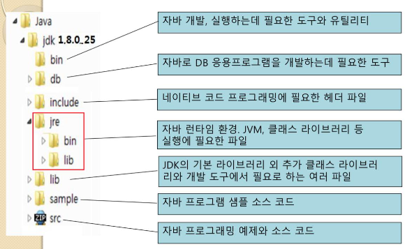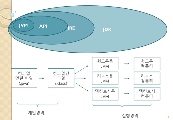 - JDK(Java Development Kit) = JRE + 개발에 필요한 도구 - JRE(Java Runtime Environment) = JVM + 표준 클래스 라이브러리