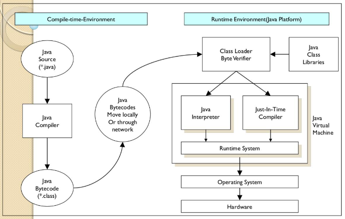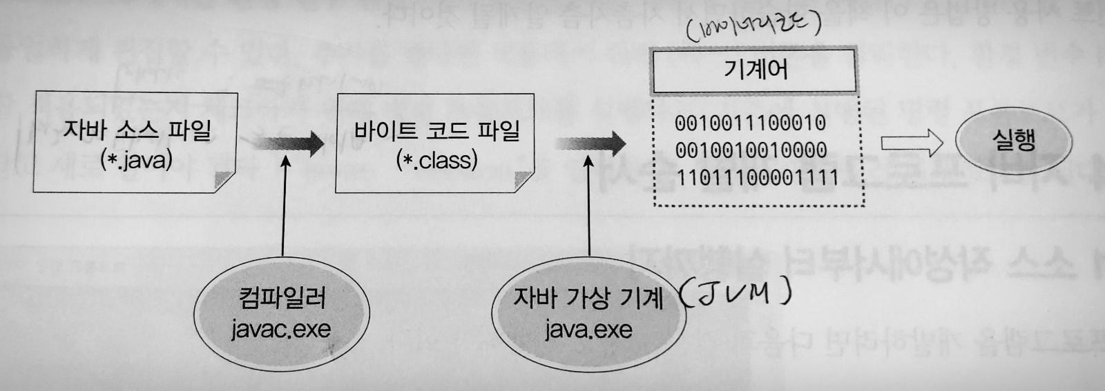 자바 프로그램은 완전한 기계어가 아닌, 중간 단계의 바이트 코드이기 때문에 이것을 해석하고 실행할 수 있는 가상의 운영체제(JVM)가 필요